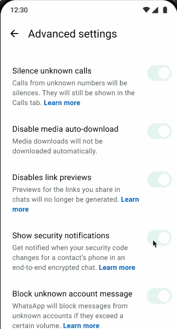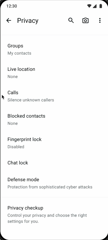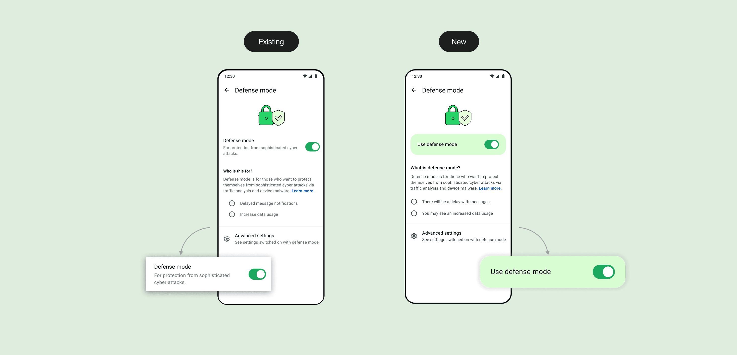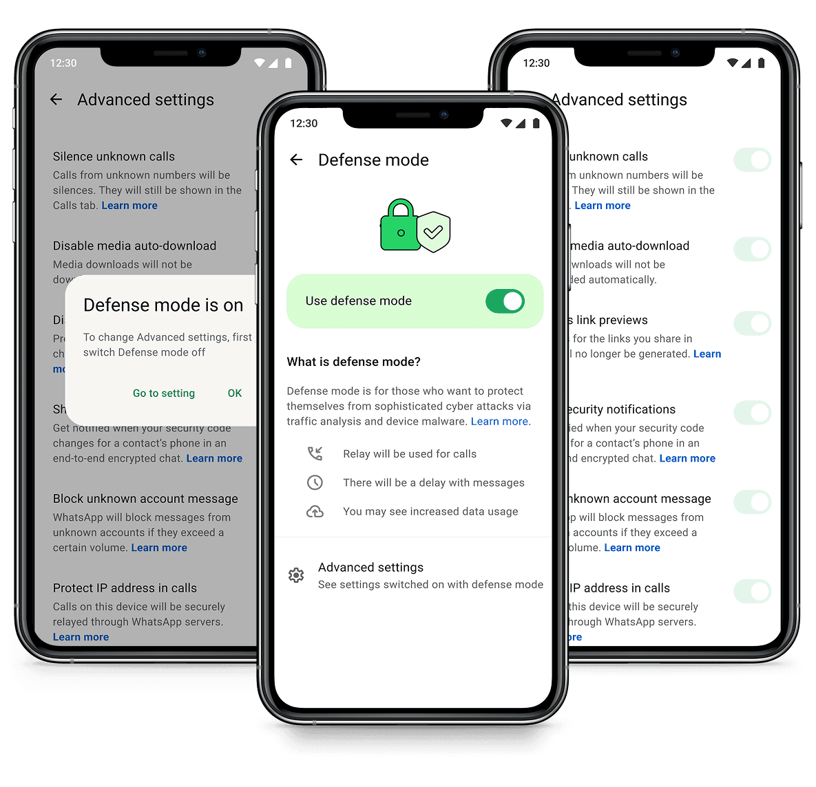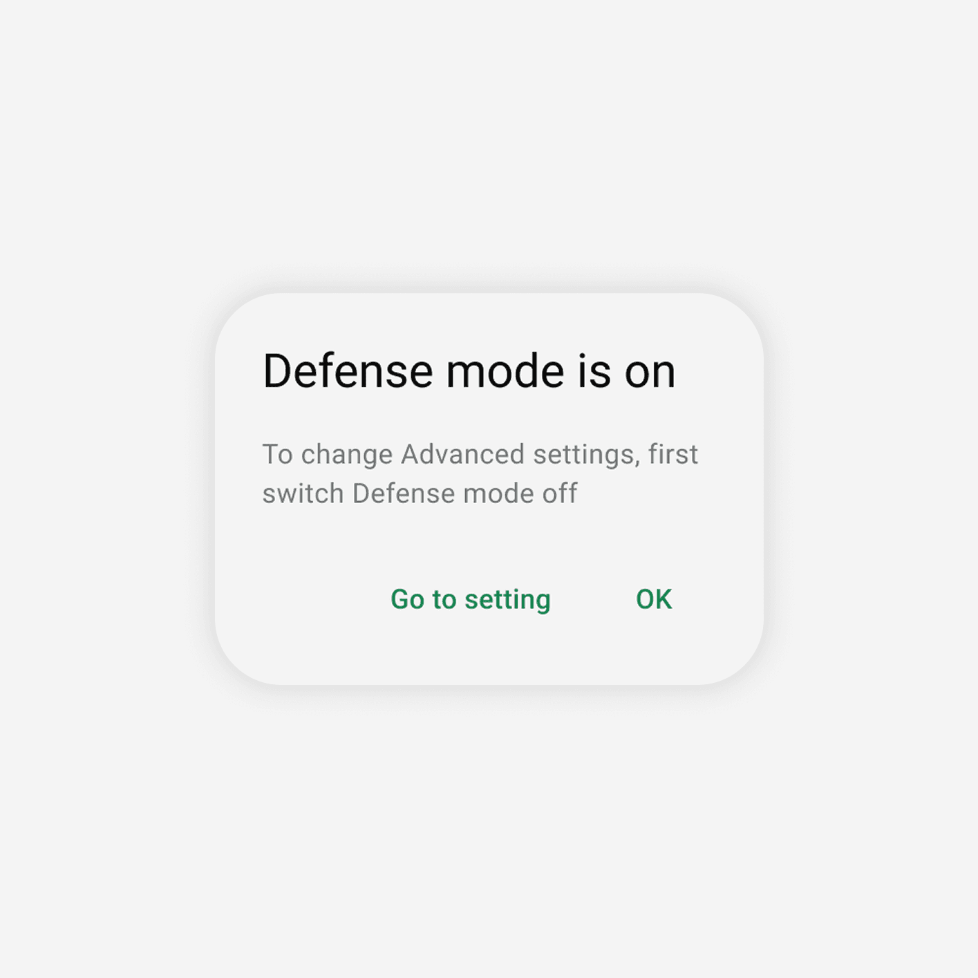 Defense Mode settings could also be accessed elsewhere in WhatsApp. When Defense Mode was on, those settings became inactive. I designed clear messaging that explained why settings were locked and guided users to Defense Mode to make changes, preventing confusion and maintaining trust.
