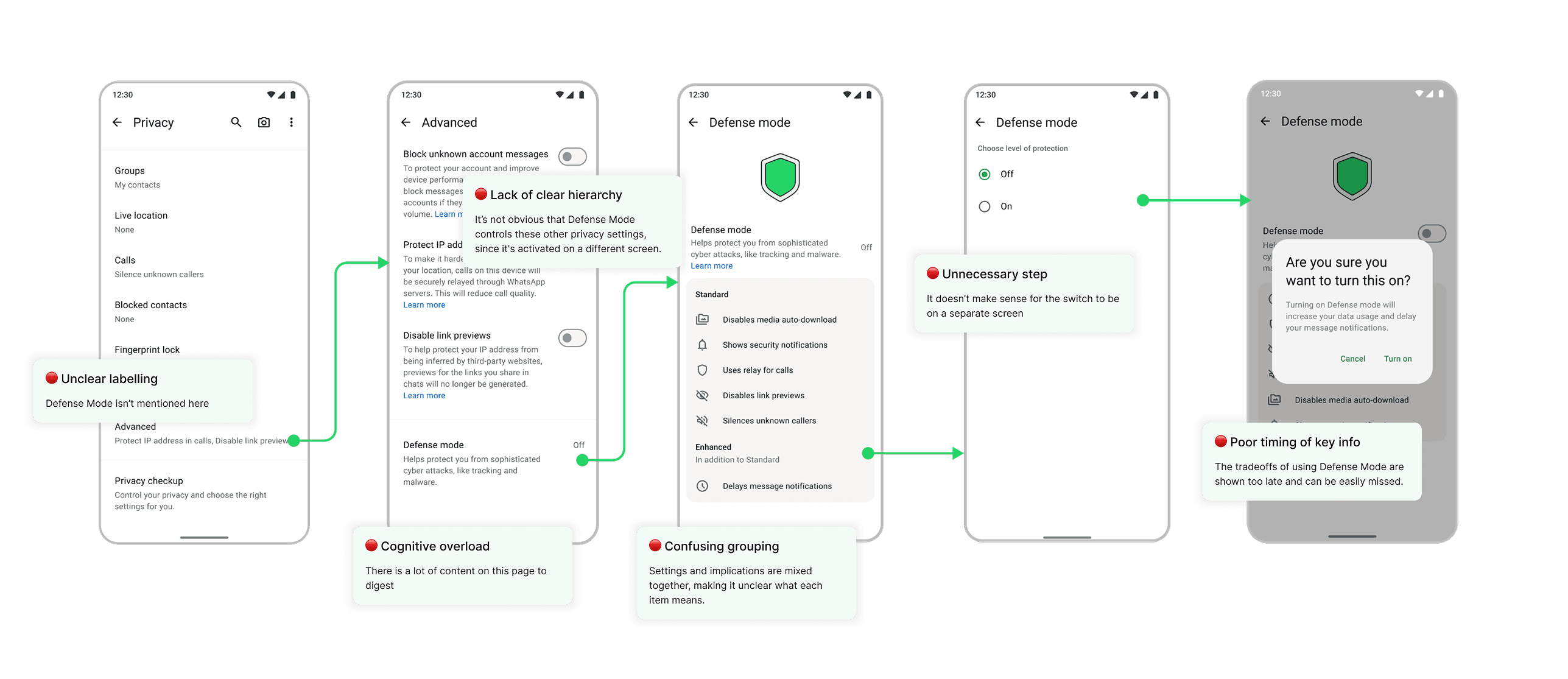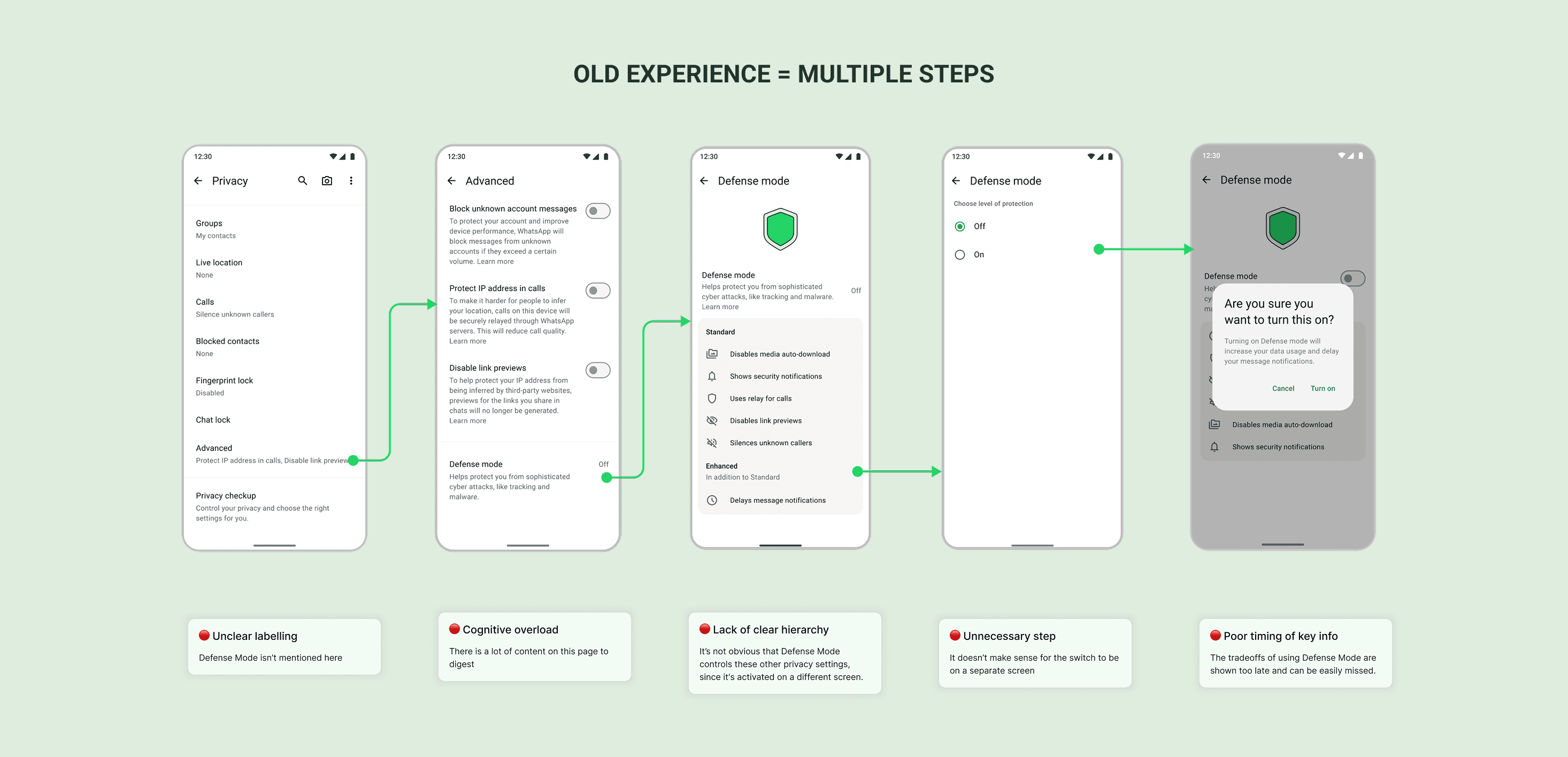 Defense Mode was presented as just another toggle, with no clear indication that it controlled multiple security settings. Key implications were hidden in pop-ups that could be easily missed, creating high cognitive load and low confidence.