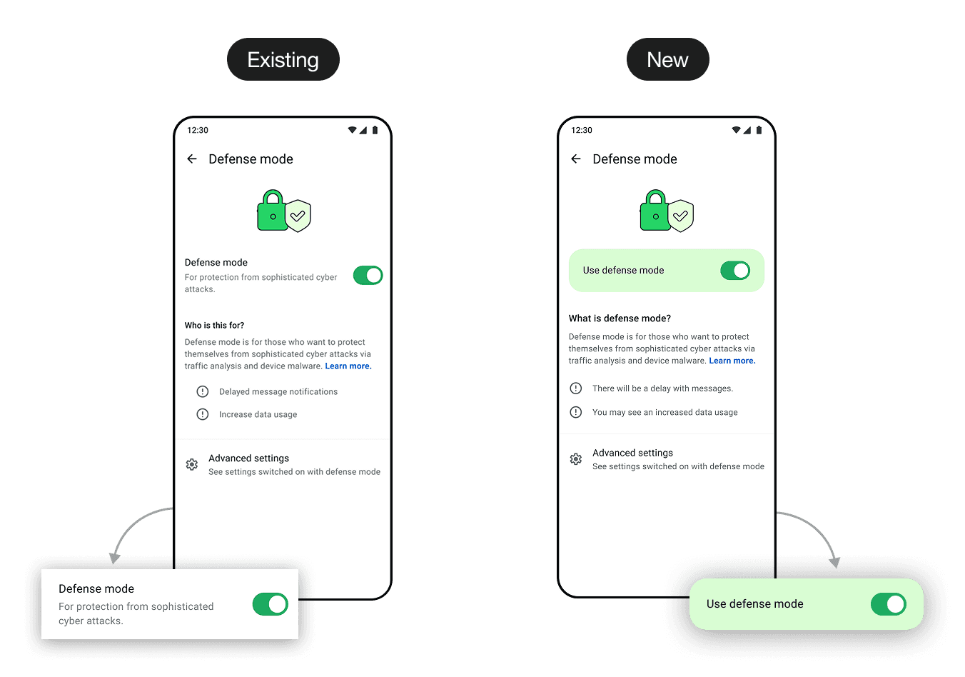 Used animations or toggling feedback to help users see settings turn on in real-time when Defense Mode is enabled.